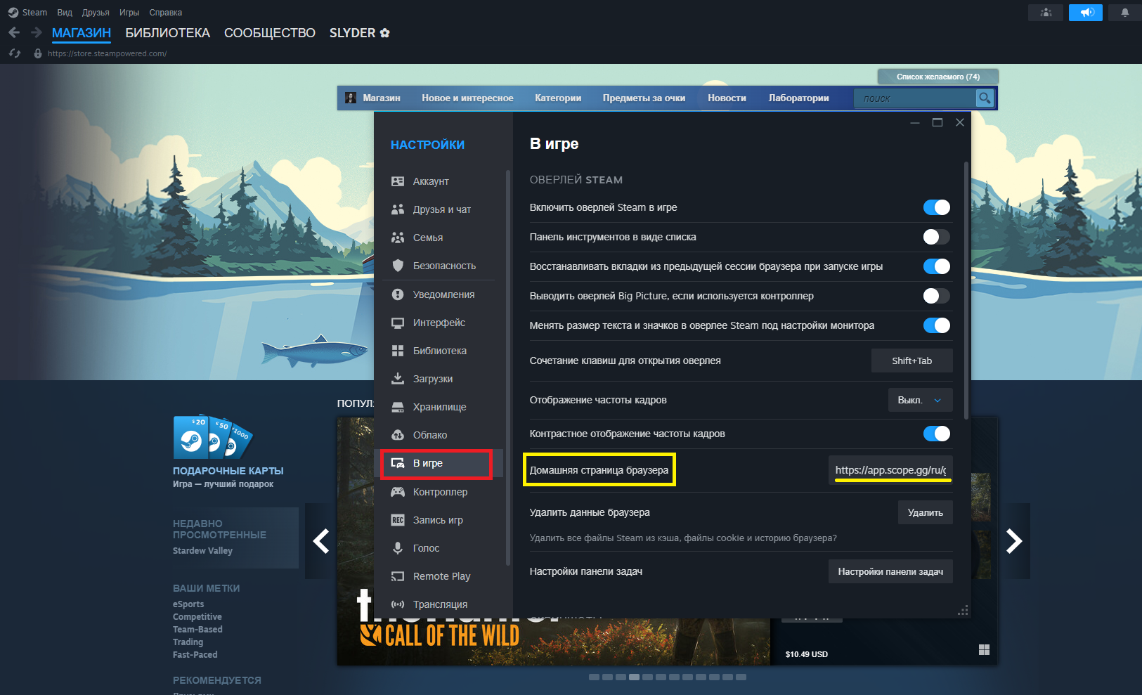 ШАГ 3. Перейти во вкладку "В игре" → "Домашняя страница браузера") и вставить следующую ссылку: https://app.scope.gg/ru/grenades